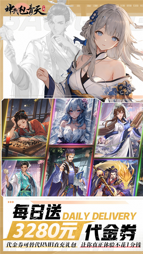 1、【每日3280元】 免费赠送“3280特权”每日登录邮件免费领取3280元代金券(代金券可拆分:替代RMB直充礼包),让你真正体验不花1分钱也能玩! 2、【创角福利】 创角即送:少年包拯*3个、韩琪*1个、888元充值卡、高级装备宝箱*1、金锭礼包*20。 3、【7日福利】 送3350客店招募令抽奖,再送开封府军巡判官“王朝马汉*4个”、“张龙赵虎*6个”。 4、【豪杰赠送】 免费赠送“核心英雄5人组:送至至尊、聚势登峰”,不用花钱也体验巅峰快感。 5、【日送2千】 累计在线时长活跃送“1700元充值卡”在线转盘再送“1000元充值卡”。 6、【送万元充】 每天累计签到可免费领取“4万元充值卡”。 7、【无限充值】 推主线闯关无限掉落充值卡。神判包青天0.1折版知已玩法介绍