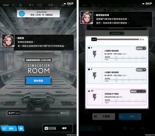 模拟室可以针对各种状况进行训练,途中能获得仅限此处可用的增益效果,可以更换组合取得最棒的战果。