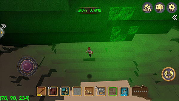 游戏的左下角有一个坐标指示,最后一个坐标接近200的时候玩家就到天空城了。天空城上有很多稀奇古怪的东西,白天只会出现小动物,到了晚上各种各样的大怪物就出现了。不过这种情况多出现在普通模式里,创造模式中玩家基本上很难遇到怪物,因为在这个模式中玩家是等同于上帝的存在。
