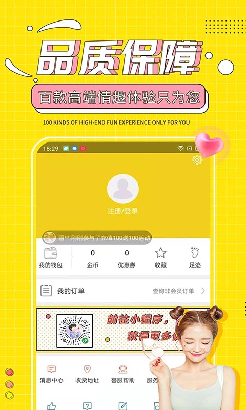 【贴心客服】一对一专属客服为你解答,每一个客户都是我们的专属VIP! 【天天活动】新用户首单半价,充值就送、爆款推荐、团购优惠、限时秒杀,活动力度大到你无法想象。 【正品严选】情趣商城中所有的产品均经过严格刷选,确保正品安全; 【隐私保护】私密配送,拒绝实体店的尴尬,守护您的情趣小秘密。 【超值优惠】直接与厂商合作,降低成本,超低价格购得高质量的情趣情趣商品。功能介绍