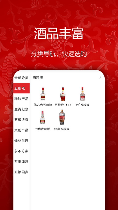 3、点击分类,大家可以看到各种度数年代的五粮液酒,自己喜欢的酒可以直接进行购买。