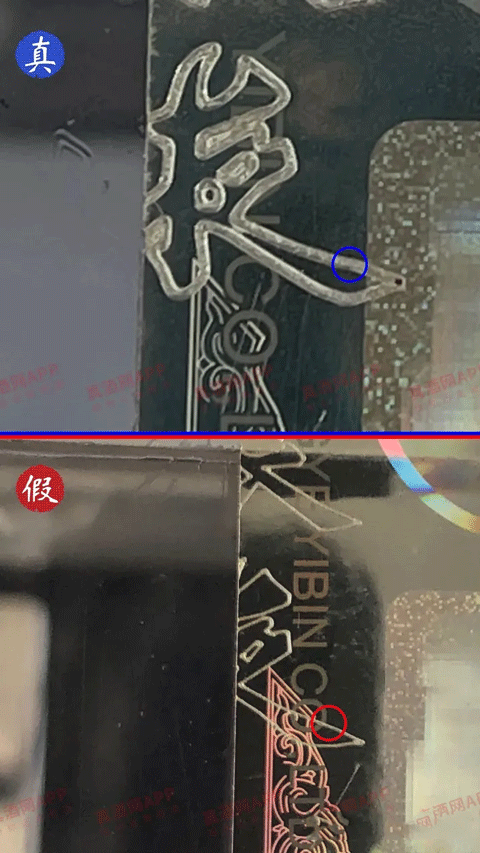 1、看酒盒防伪标刻码-左侧 真:真的“粮”字一点是四笔组成的; 假:如果“粮”字一点不是四笔组成,而且转角是弧形的,基本可以确定是假的;