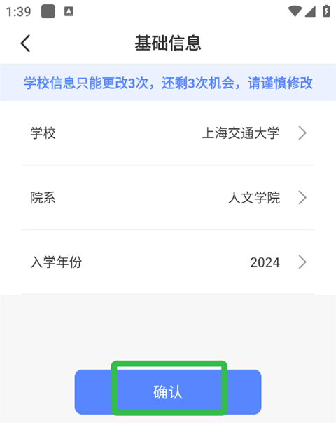 3、可以修改学校、院系以及入学年份等信息,点击【确认】就修改成了。