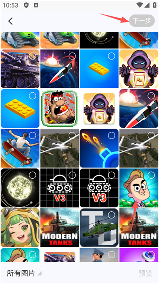 4、在相册中选择需要加密的照片,点击屏幕右上方的“下一步”。