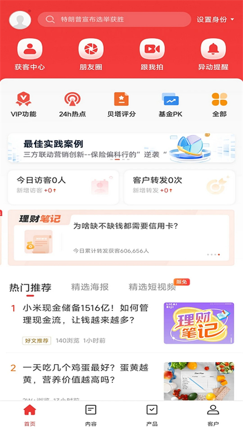1、市场陪伴及解读:7×24小时不间断提供早间投教、短视频,热点解读、理财笔记等营销素材,帮助金融顾问和理财师营造真实生动、专业有料的人设,打造差异化朋友圈;比如【财经早报】,每日早间根据客户偏好,生成理财师的专属早报和专业点评,提供文字、视频、音频多种展现形式,让客户阅读更生动,更有趣。 2、商机发现:借力微信生态,实时获取所有资讯、产品的客户阅读轨迹,了解客户财经话题&产品的偏好,获取多度人脉以及销售机会。 3、产品讲解:依托Beta10余年基金研究和超320万只金融产品数据,提供宏观解读、市场情绪等市场分析工具,基金、理财、保险、信贷等一系列金融产品深度解读。 4、投后陪伴:建立电子台账,提供重点产品异动提醒与调仓、解套建议。根据客户持仓一键生成诊断报告,提供AI调仓建议或自制建议书。 5、成长社区:提供AI智能对练,从业考试,资产配置大赛,大咖分享等工具,赋能金融顾问和理财师专业能力、营销能力的提升。beta理财师app使用说明