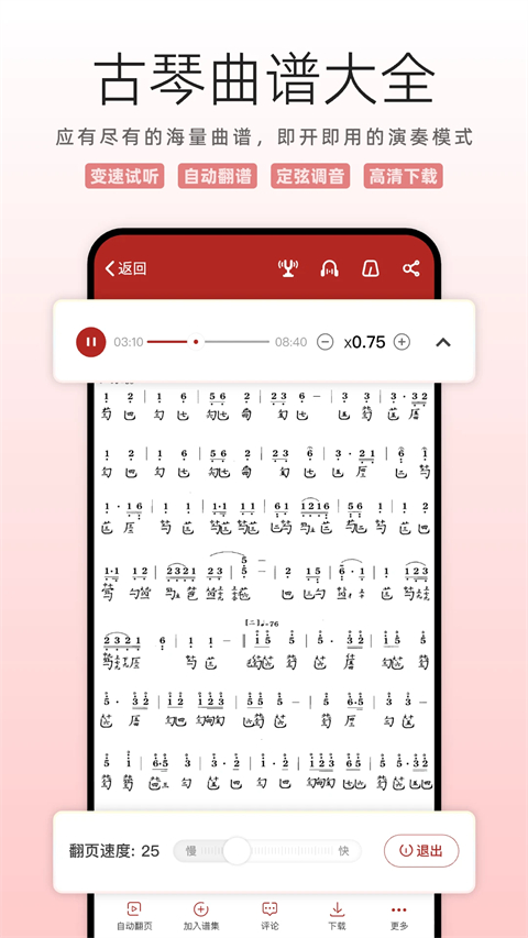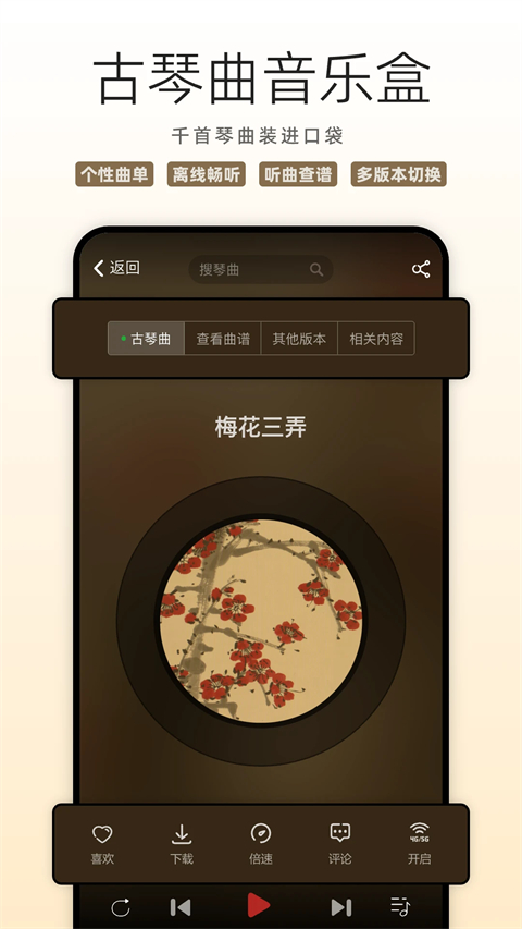 1、国琴网-古琴爱好者们的古琴交流领地 提供原创古琴教学视频,精心收集古琴曲/谱以及资讯。 2、手机里贴心的古琴管家 “古琴名曲、古琴谱、古琴视频、线上直播教学,你想要的,这里都有!” 3、只做专业的古琴传承 保护和传承的路上没有同行者,每天的我们都在不断超越自己。软件功能