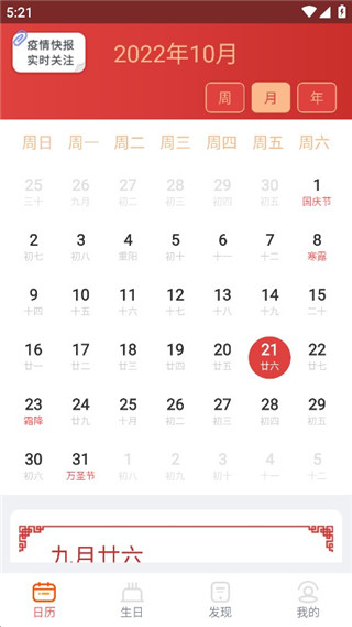 1、丰富的历法:公历,农历,新历,黄历,万年历,干支历,信息量丰富 2、老黄历相关:每日吉凶宜忌,节气时令,天干地支,知晓传统历法文化 3、日程管理:贴心日程管家,您可以自定义纪念日,生日,计算倒数日,添加待办事项,任务清单,设定提醒闹钟与闹铃铃声,不错过每一件重要的小事与每一个有意义的日子 4、生日助手:新增生日助手,贴心提醒亲友生日时刻关护 5、二十四节气养生知识,呵护您的健康 6、节假日放假调休提示,让您不再错过每个假期中国万年历App官方版使用教程
