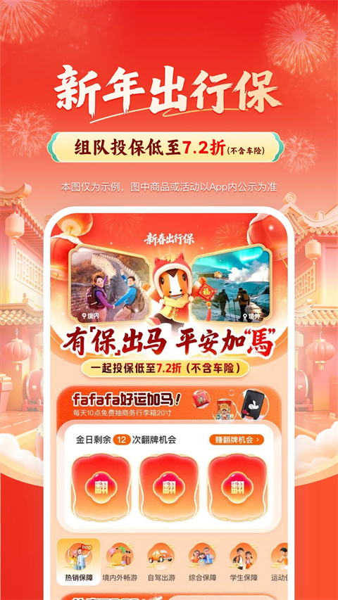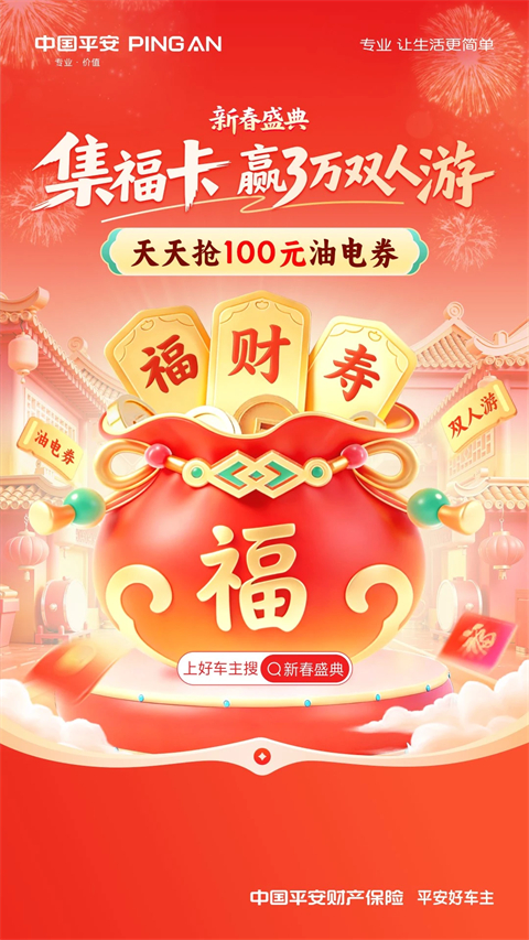 1、【好车主新春盛典】集福卡,赢3万元国内双人游 2、【新春盛典 年货节】囤年货,每日定时1元抢年货 3、【新春出行保】组队投保低至7.2折(不含车险) 4、【新年焕新家】领家财险9折券