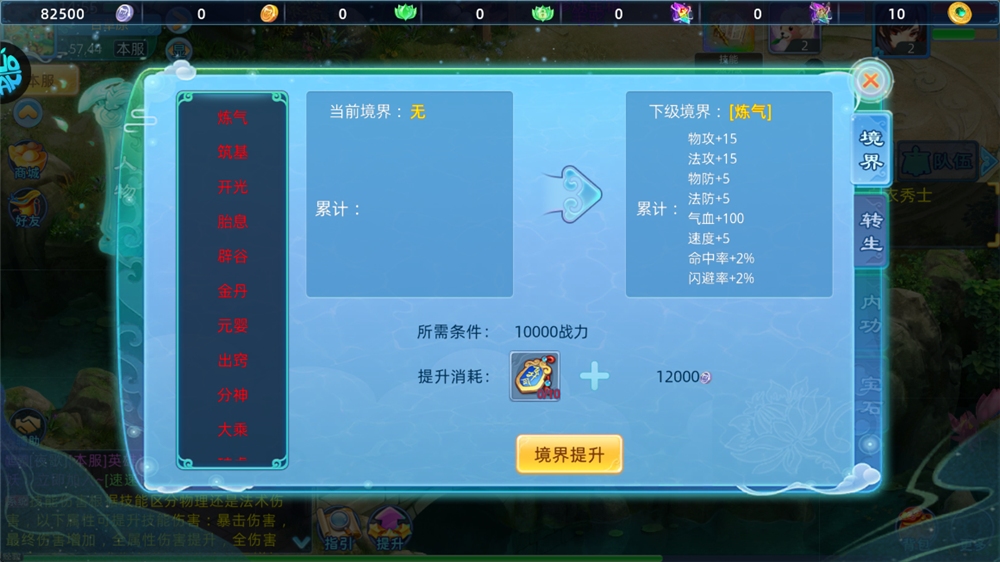 提升境界可以小幅度提升基础属性数值和命中率、闪避率。