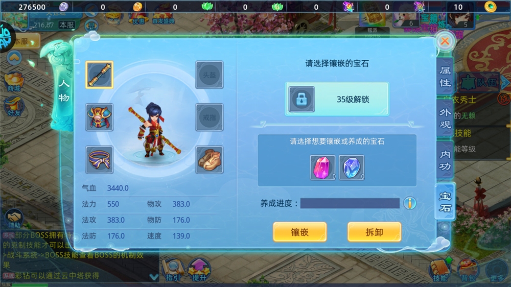 镶嵌宝石后其生效属性会按已镶嵌的宝石等级提升,宝石镶嵌等级越高,其升级所需的进度随之提高。每镶嵌1颗宝石固定+1进度,每个部位只允许镶嵌上1种宝石。如过需要更换石,必须先拆卸才能重新镶嵌。