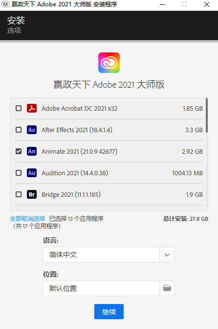 Adobe 2021大师版是一款集成了Adobe 2021全家桶软件的合集包,它包含了Photoshop、After Effects、Premiere Pro等所有Adobe系列的2021版本,并提供了可独立安装的SP版和体积较大的大师版供用户选择。同时软件安装简单方便,只需根据提示操作即可,支持自定义选择简体中文和设置安装路径,同时集成了补丁,无需激活序列码即可直接免费使用!但需要注意的是,由于Adobe 2021的配置需求,该大师版需安装在最新的Windows 10系统上,并要求配置高性能硬盘和足够的剩余空间,欢迎有需要的用户下载体验。