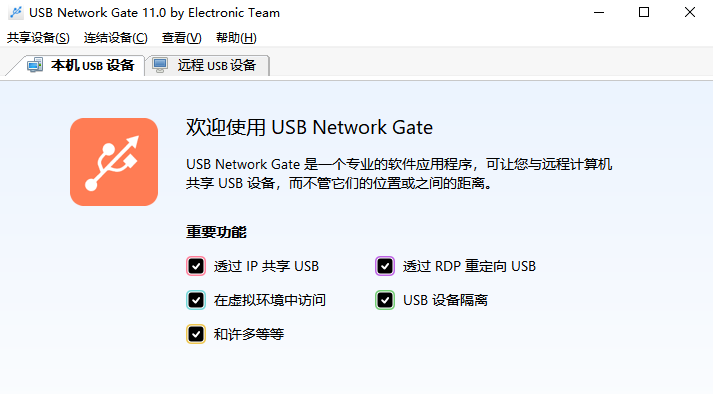 1、通过IP网络共享USB USB Network Gate提供了许多方便的功能,这些功能使通过以太网共享USB变得容易,快捷。现在,任何用户都可以通过办公室中的任何计算机通过以太网打印,扫描,访问USB许可证加密狗和USB集线器,无论它有多大以及占用了多少层。 2、USB over Ethernet数据流量优化 通过USB to Ethernet Connector流量压缩选项,可以大大提高传输速度和带宽利用率。与倾向于传输未压缩数据的设备一起使用时,此选项将特别有用。 3、安全地通过Wi-Fi共享USB 现代世界上最有价值的资源是信息,而我们的IP over USB软件将确保没有第三方可以访问您的信息。嵌入式流量加密选项提供了高度安全的连接标准。此外,您可以添加密码来控制远程用户访问。 4、将您的计算机变成USB服务器 不需要每次共享另一台设备时都重新启动计算机或重新启动软件。只需拔下当前共享的USB设备并插入另一台USB设备,就这么简单!由于应用程序通过网络而不是仅通过连接的设备共享USB端口,因此新设备将自动出现在远程客户端上。 通过RDP共享USB使用远程桌面连接时可能会遇到的常见问题是无法访问本地USB设备。软件允许您即使在远程会话中也可以使用任何本地USB设备。此外,您可以将远程计算机设置为立即自动检测并连接到共享的USB设备,就像您只是将设备物理地插入远程计算机一样。 5、Citrix ICA协议支持 如果您不使用Microsoft RDP或客户端计算机运行Windows以外的操作系统,请不要担心:USB设备重定向可以通过Citrix ICA协议完成。从7.0版开始,软件本身就支持Citrix ICA。 6、RemoteFX USB重定向支持 软件支持本机RemoteFX USB重定向(MS-RDPEUSB),使您可以将共享的设备从本地Linux计算机重定向到远程Windows客户端,而无需在后者上安装软件。请注意,RemoteFX USB重定向必须支持共享的USB设备。否则,您需要在Windows客户端上安装软件。 7、全面改进和改进的USB设备隔离 Windows的一项不便功能是,默认情况下,所有用户都可以使用每个连接的USB设备。由于Windows没有提供足够的工具来控制特定用户对特定设备的访问,因此当有很多用户在同一Windows PC或承载大量IP地址的终端服务器上工作时,这可能会造成严重的问题。远程桌面会话。幸运的是,软件提供了独特的设备隔离功能,可以解决该问题。安装教程
