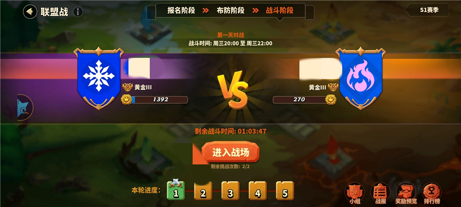 1、【联盟战阶段】 盟战一共分为三个阶段:休息期,布防期和战斗期。一般休息期持续两天时间,布防期和战斗期为同一天进行,具体请以游戏内显示时间为准(黄金以下每次盟战胜利提升一个小段位,黄金以上会分到不同组别进行车轮战,小组前两名晋级下一段位)