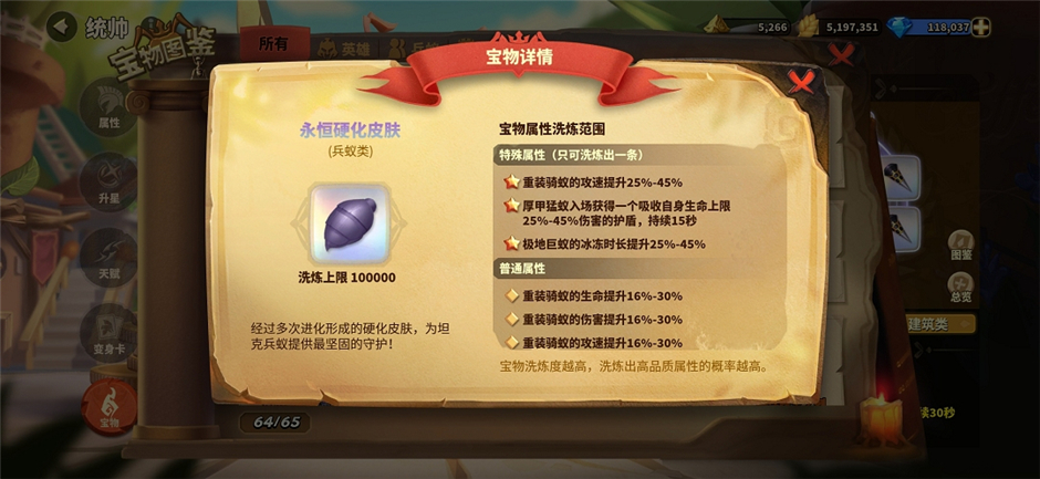 极地巨蚁对应的宝物是硬化皮肤,该法宝一共有6种属性可以供玩家选择,而良好的选择可以极大的提高极地巨蚁的能力。