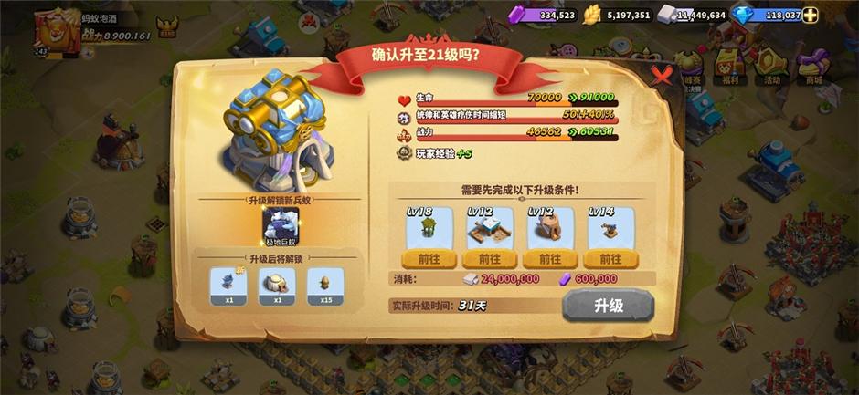 解锁极地巨蚁的条件只有一个,那就是蚁后宫殿升级到21级。完成这一条件后,各位统帅就可以在兵蚁军械所训练极地巨蚁了。