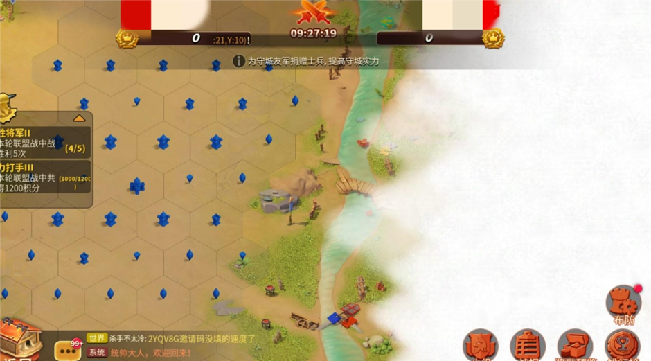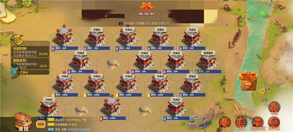 布防期:联盟战力榜前30名的成员会自动参与盟战,并分别依据自身排名获得对应积分的城池(盟主所在城池积分最高)。布防期我们可以做的就是为各个城池捐助士兵,所以即使我们战力不够依然可以为盟战作出各自的贡献,每人捐兵上限为30次,捐兵还会获得少量普通果实,记得一定不要吝啬捐助高级兵种哦,因为这可能关系到一场战斗的胜负。此外布防阶段还可以做的另一件事情我们放在后面讲。