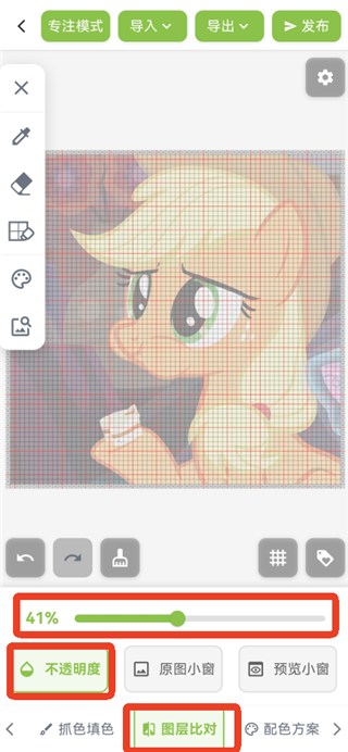 14、在【图层对比】拉透明度可以查看画的效果,点击右下方的网格符号可以关闭网格效果。