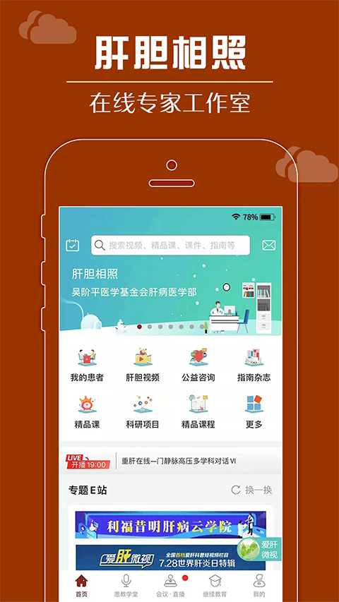 1、【我的患者】:轻松管理优质患者,专业随访队列,积累大数据。 2、【我的科研】:申请科研课题,加强横向纵向合作。 3、【我的图书馆】:免费下载查阅国内国际治疗指南、共识、临床路径,万方医学,实用工具简化诊疗流程。 4、【公益咨询】:建立医生品牌,用公益奉献爱心。 5、【患教学堂】:用通俗易懂的文字将肝胆病科普知识传达给公众。 6、【肝胆资讯】:及时传递肝胆新闻。 7、【肝病学院】:线上线下教学相结合,肝胆病青年医生成长与发展的摇篮与平台。 8、【肝病检测】:申请肝病检测,指导临床诊治。 9、【圈内交流】:经典病例、病例讨论,临床招募、技术资讯齐分享。 10、【肝胆会议】:会议视频直播,不在现场也能学“肝”货。 11、【肝胆视频】:肝胆会议视频回放,权威专家精彩公开课与讲座。肝胆相照专家版app怎么注册