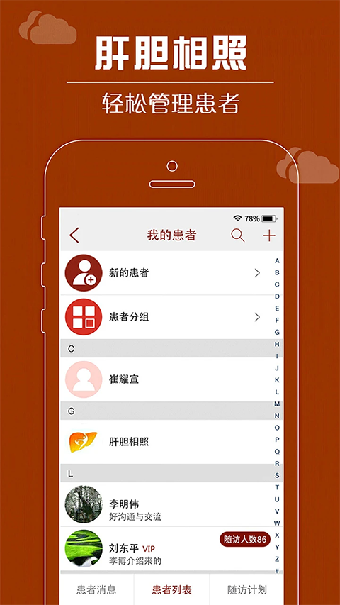 1、软件有丰富的功能应用,该功能导航页面展示了公益咨询、肝胆视频以及肝病检测等应用功能。 2、首页可以看见自己在平台上的服务评价,看得到自己获得的小红花、关注管理的人数等。 3、轻松就能管理患者,设置了分组管理的功能,支持将不同患者进行分组,方便管理。 4、多种不同的期刊杂志,有中文文献、英文文献以及万方医学等不同的文献期款专栏。 5、提供专属的病例讨论专区,所有专家都能将自己的病例发布并与其他专家在线讨论。 6、开设了肝胆会议专栏,展示了全球不同地区召开的大型会议视频内容,还设置了清晰的引导筛选条件。软件优势