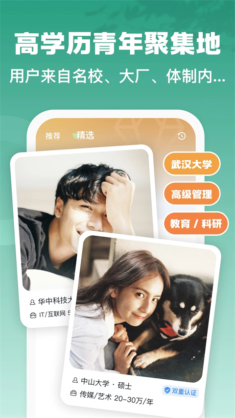 1、高学历优质青年的交友平台 2、人工审核,真实丰富,让你更了解Ta 3、平台个性化推荐,“喜欢”就不怕错过 4、轻松接触对的人,节约时间,免除骚扰软件亮点