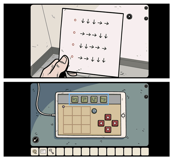 回到一楼将数据线插入平板,根据提示纸的步骤依次点击方向键获得四个「符号」。