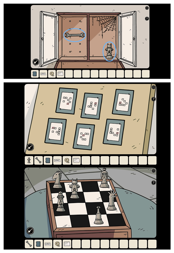 输入符号打开书柜拿到「扳手」和「棋子」,再观察留言板上的卡片(注意每个棋子对应的位置),接着将棋盘棋子放置正确的位置(如上图)获得「电池」。