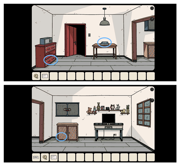 到二楼右侧房间用扳手卸下扫描仪的电源盖再装上电池,然后根据纸条上的提示依次扫描四件道具获得四个「符号密码」,最后打开左上方的柜子拿到里面的「砂纸」和「面粉」。