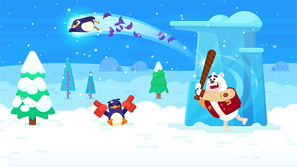 2、在企鹅掉落瞬间,点击屏幕,北极熊将用棒球棍将其击飞;
