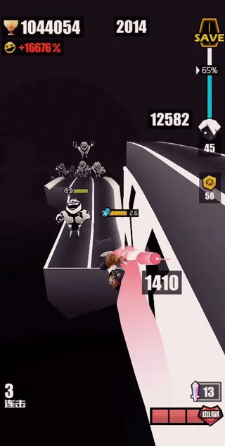 1、基础玩法:游戏中「跑酷」是一项基础的常规操作,你要负责做的就是,上跳下窜、左躲右闪,除了躲避障碍物以外,还要对沿路上攻击拦截你得小丑们,重磅出拳击垮它们。