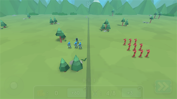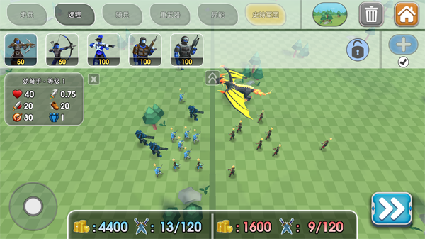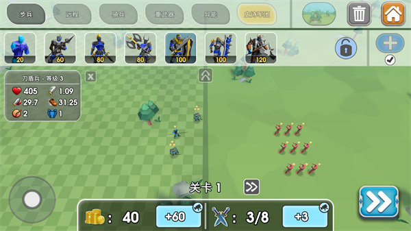 2、游戏的操作很简单,单人战役为闯关的玩法,进入游戏后可以看到敌方的阵营情况,你可以依次来部署你的队伍,只需点击上方的任一兵种,再点击空白位置,就可以将该兵种部署在此地,再次点击则可以取消本次部署。