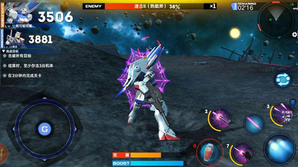 每架敢达除了拥有常规的四个普通技能以外,不同的机体还有专属的技能组合。如翔翼型强袭敢达就有两种不同的技能组合。使用普通格斗接强袭飞踢,即可使出光束军刀将敌机击飞。又或者使用普通格斗后可以立马使用破甲者对敌机造成麻痹效果,使其不能动弹。在格纳库中找到你的敢达,点击技能选项,就可以看到技能组合的效果,同时游戏还贴心内置了演示系统和练习系统让你在实战时更加得心应手。