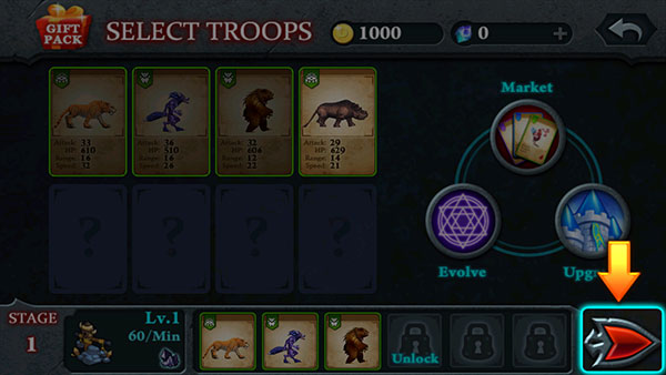 3、挑选完成后,点击右下角的箭头开始战斗。
