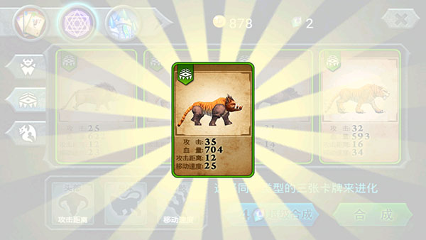 1、兽王进化,提高兽王的能力。注意:进化需要消耗三张卡牌,能力增长的性价比不高,不适合前期使用,绿色蓝色的卡牌不建议使用进化,到后期为紫色卡牌进化突破紫卡的能力上限。