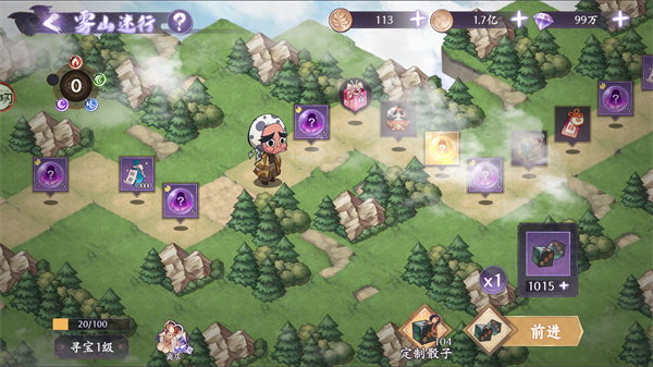雾山迷行 1、每次投掷骰子消耗1颗普通骰子,根据点数前进对应的步数,每日0点、12点分别增加5颗普通骰子。 2、定制骰子:可以指定下次投掷所需要的点数。 3、宝石指盘:每投掷10次骰子会点亮盘上的一颗宝石,集齐5颗可以获得稀有奖励。 4、每次投掷会增加5点寻宝经验,寻宝经验用于提升玩家的寻宝等级,寻宝等级提升后格子上的各种奖励会随之提升,还能解锁新的随机事件。