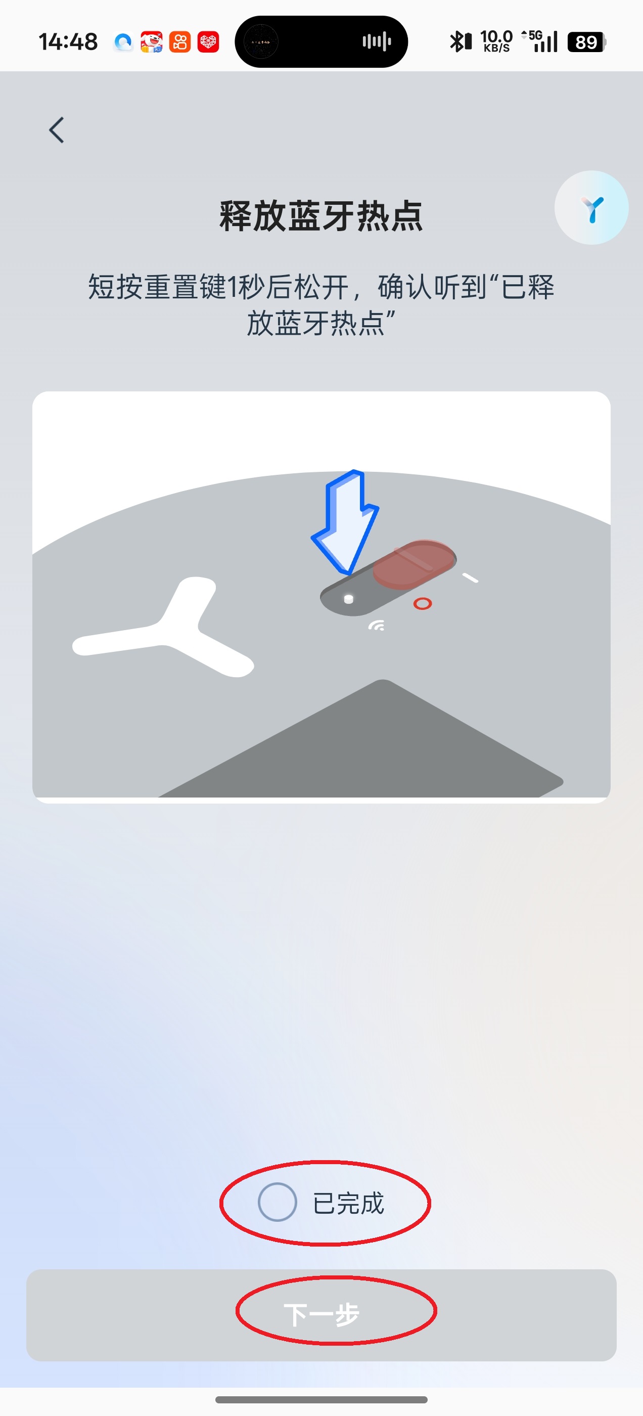 5、随后边是按照步骤开启蓝也热点,随后同样点击“已完成”,“下一步”,当然,手机也得开启蓝牙。