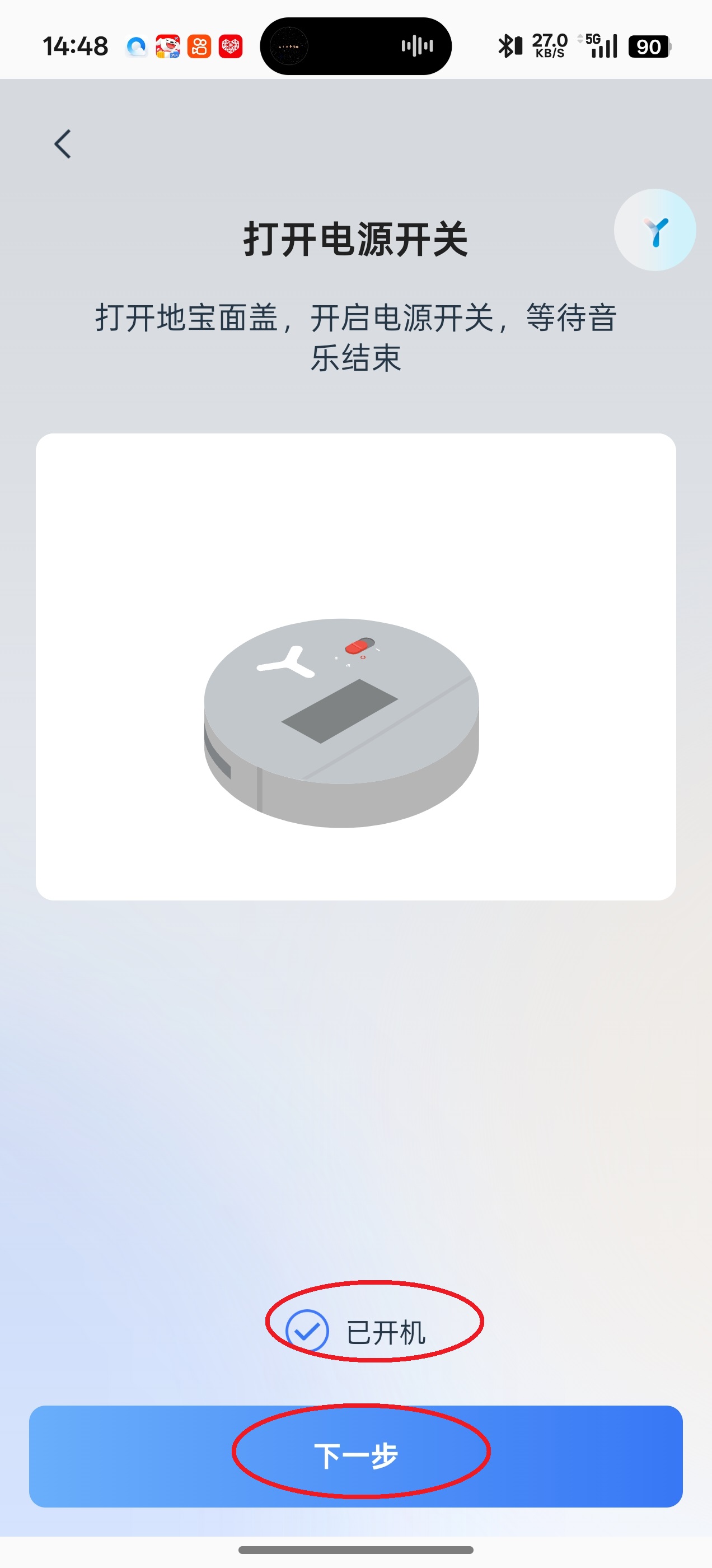 4、按照步骤提示,一步一步完成所有步骤,先是打开机械人的电源开关,随后点击屏幕下方的“已开机”,再点击“下一步”。