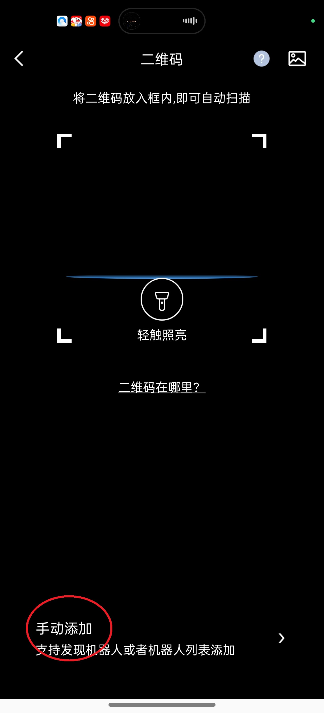2、找到机械人身上的二维码,如果未找到或者扫码失败,可以尝试点击屏幕下方的“手动添加”。