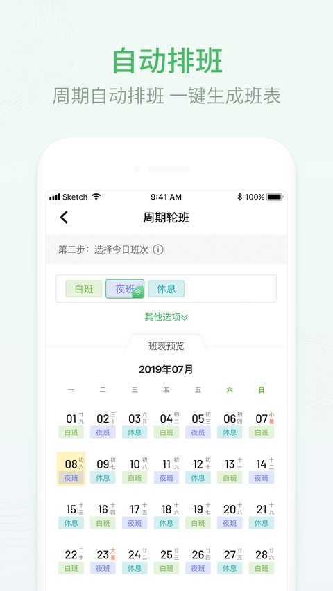 1、轮班闹钟 依据班次表的不同班次智能响铃,不用再每天去手动设置系统闹钟,省却倒班人群日常烦恼。 2、数据备份 微信登陆可以将数据自动同步至云端,即使换手机也不会丢失数据。还可同时使用同名微信小程序,数据同步,更方便查看班表。 3、操作简单 周期和手动两种排班方式,分别针对周期固定和不固定的工作人群;操作流程简单,可根据一个周期的工作安排自动生成专属工作班表。 4、排班日历 界面清爽简洁,只为最纯净的使用体验。还可将特定月份班表生成为图片分享给同事,方便协商调换班。软件亮点