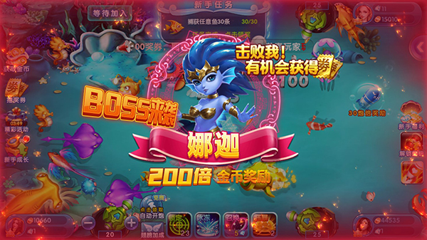 1、玩家进入游戏就可以开始捕鱼啦,点击屏幕就能发射炮弹,玩家可以选择自己要捕的鱼进行射击。