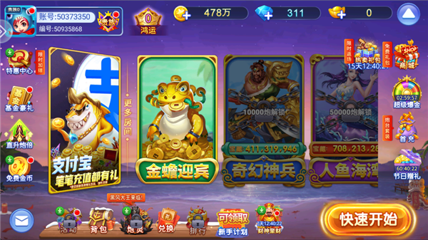 【炮台使用】 1、依据场景选倍数 在鱼群密集且多为小鱼的场景,可先用低倍数炮台,以量取胜,积累金币;在有大鱼或 BOSS 鱼出没的场景,再切换到高倍数炮台。比如在普通捕鱼房,先用 100 倍左右炮台打小鱼,若出现鲨鱼等大型 BOSS,就切换成 500 倍甚至更高倍数的炮台。 2、升级要适度 不要盲目追求高等级炮台,应根据自己的金币数量和游戏局势来升级。若金币有限,过度升级炮台可能导致很快破产;而在有把握捕获大鱼时,适时升级则能提高成功率和收益。 【捕鱼时机】 1、观察鱼群速度 鱼群游动速度慢时,是捕捉的好时机,如乌龟、比目鱼等,可轻松命中;而对于游动速度快的鱼群,需预判其路线,提前发射炮弹。 2、趁乱出击 当屏幕上出现鱼群聚集、交错游动的混乱局面时,果断开炮,有机会一炮多鱼。 3、把握特殊时期 游戏中有时会出现特殊时段,如激光时间、狂暴时间等,此时捕鱼成功率会提高,要抓住机会加大投注和攻击力度。 【鱼类选择】 1、优先打小鱼 小鱼数量多、容易捕获,能快速积累金币和经验值。像小丑鱼、小金鱼等,可作为主要捕捉目标,先保证自己有稳定的收入。 2、合理挑战大鱼 大鱼分值高,但捕获难度大。可在积累了一定金币后,选择合适时机和位置攻击,比如当大鱼迎面游来时,瞄准其头部射击,且配合使用道具,以提高成功率。 3、关注 BOSS 鱼 BOSS 鱼不仅分值超高,还可能掉落珍贵道具和弹头。但 BOSS 鱼通常比较难打,需多人合作或在自己状态好、有足够金币和道具支持时再挑战,如利用冰冻技能冻住 BOSS 鱼后再集中火力攻击。 【道具运用】 1、冰冻道具 用于冻住鱼群,使其暂时无法移动,方便瞄准和射击。可在鱼群密集或有大鱼出现时使用,提高捕获率。 2、锁定道具 能锁定特定的鱼,确保炮弹准确命中。对于一些高价值或难以捕捉的鱼,使用锁定道具可增加成功机会。 3、能量炮 当能量槽满时可获得,能增加捕鱼成功率。要合理利用能量炮,在关键时刻发射,争取一击必中。 4、其他道具 如狂暴道具能提升炮台威力,炸弹道具可瞬间消灭屏幕上的部分鱼等,根据游戏局势灵活运用。更新日志
