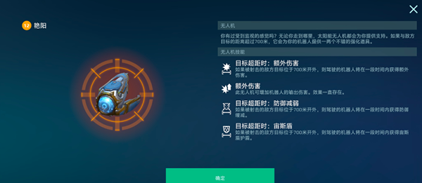 无人机首选【艳阳】,堪称远程机甲的最佳搭档之一。当【耀斑】对 700 米外目标发起攻击时,【艳阳】能为其提供额外伤害增幅,同时叠加防御点数与宙斯盾护盾,再加上无人机自带的输出加成,让【耀斑】的伤害与生存能力均跻身同类型机甲第一梯队。
