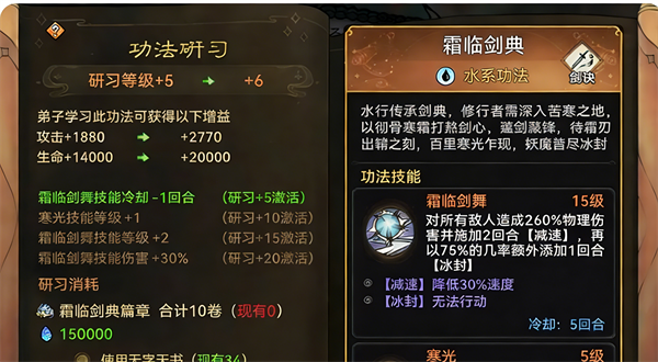 研习高的功法我们可以让弟子学习,即使不装备也可以吃到方框内的加成。