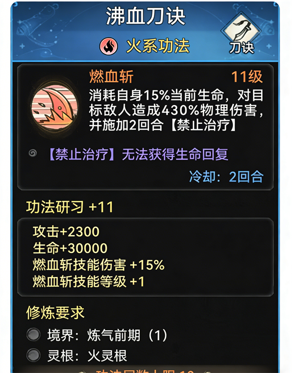 另外,功法研习方面,前期推荐蓝色研习【沸火刀诀】,