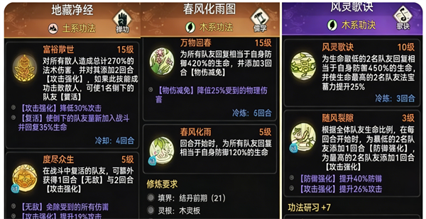 和【元润】、【五行禅】类似,但是由于低天命没有锁血,带【地藏净经】效果不好,可以选择带一个复活功法,比如:【渡魂歌诀】、【风魂仙法】、【山海梦见集】等;再带一个防御、回血类功法,比如:【玄岩咒录】、【风灵歌诀】、【魂归咒录】等。可以根据实际情况灵活调整。