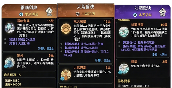 小唐作为一速控制手时,可以携带功法【霜临剑典】+【清心道典】或【大荒兽决】;在打每周受潮时作为纯粹辅助时可以带【灵祭咒录】+【对酒歌诀】。