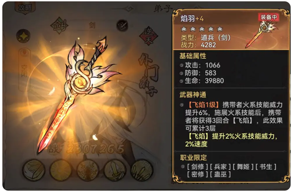 道兵:推荐使用活动【太初道兵】赠送的【焰羽】。只有 一把【焰羽】的话优先给【五行剑】,平民道兵不多,可以选择不带。
