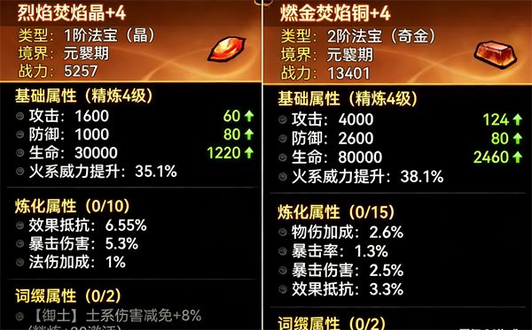 法宝:一阶用火晶,二阶用火铜,三阶没有好点的火系输出法宝,所以依旧用火铜;紫色就能用低阶法宝品质不强求。(法宝炼化物伤)