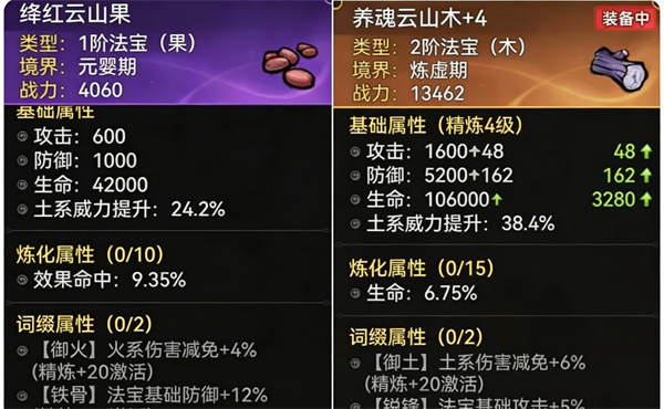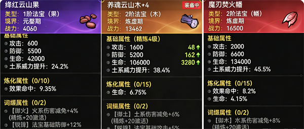 法宝:一阶可以带果子过渡,二阶用养魂木,三阶段【元润】基本可以下岗了,不考虑。法宝带什么可以根据携带的功法属性灵活选择。