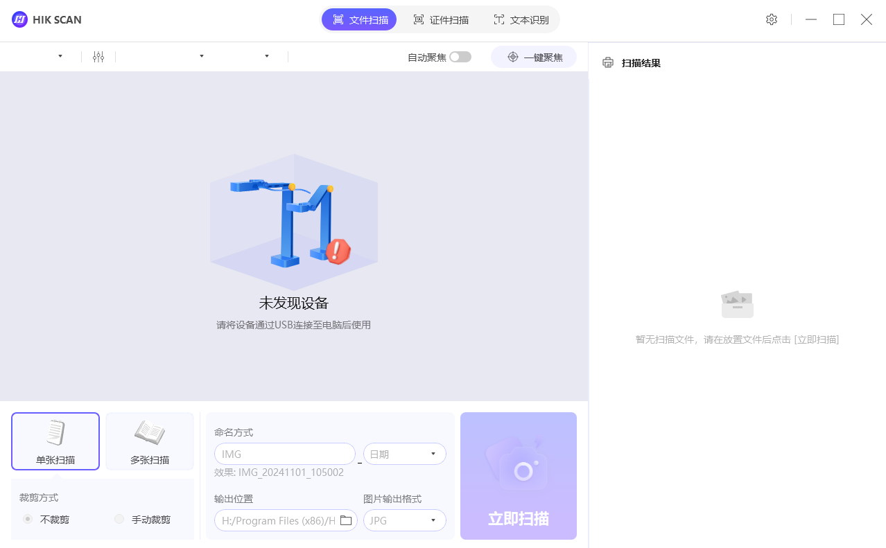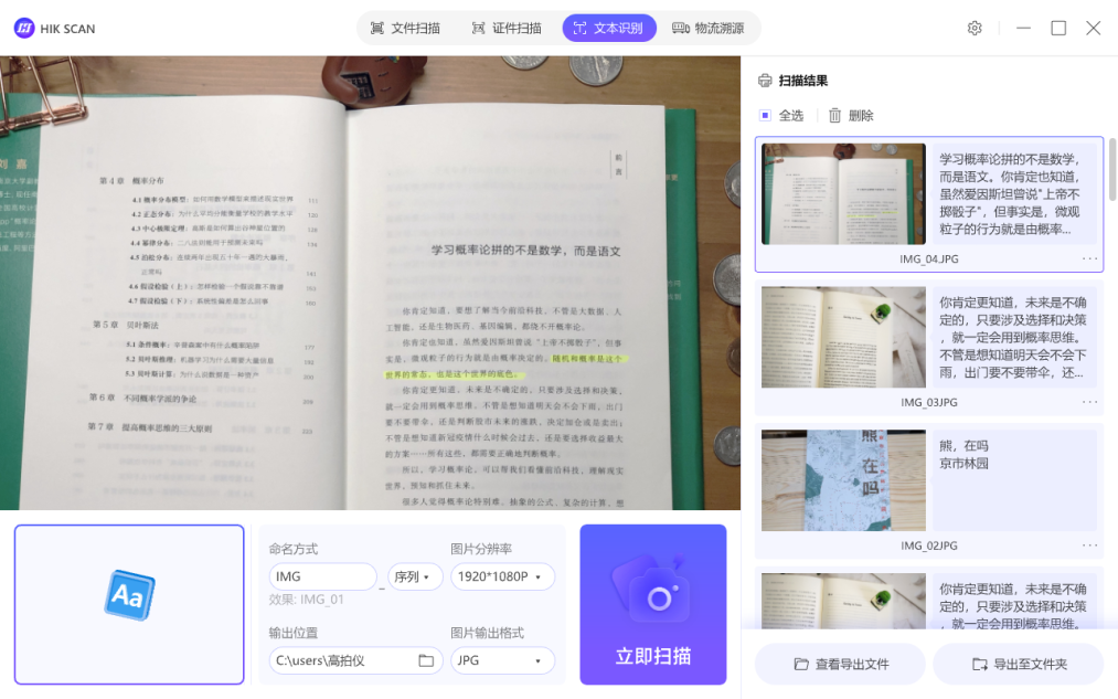 海康高拍仪助手(HIK SCAN)是海康威视推出的一款配套海康高拍仪的扫描工具客户端,它集成了高效的OCR文字识别功能,支持用户手动框选区域,能够精准地将扫描文档中的文字转换为可编辑的文本,并支持一键导出为Word、Excel或TXT等格式。