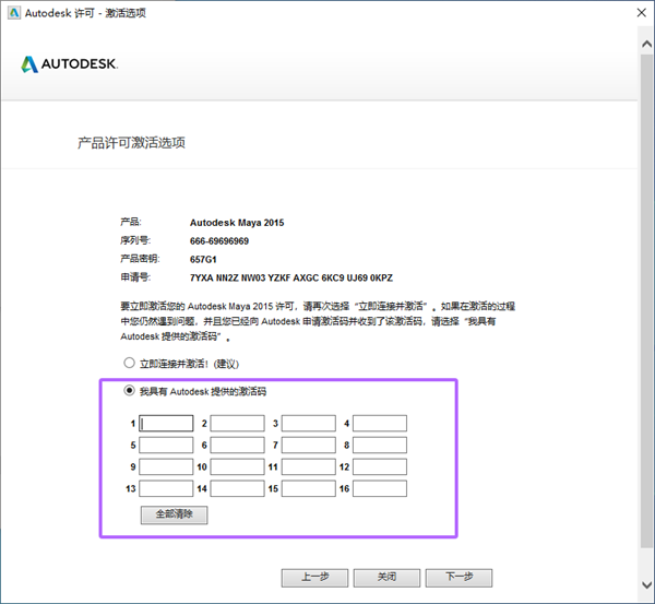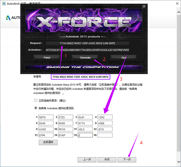 14、将申请号复制到注册机,点击第二个按钮,随后将激活码粘贴到激活界面里面,点击下一步,详细如图所示。